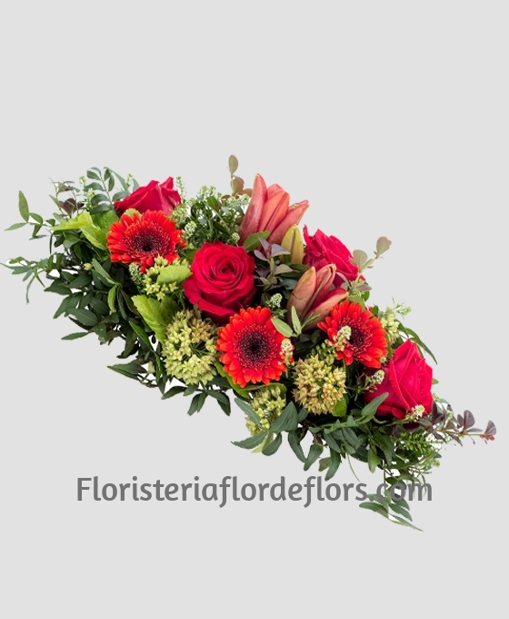 Nuestro Centro Funerario Alargado Basic, está compuesto por 4 rosas, 2 liliums, 4 gerberas, flores para el tanatorio de relleno tonos amarillos, verdes variados y esponja. Está diseñado en flor rojo. El color se puede cambiar a gusto del cliente y efectuarlo en la tonalidad que mas guste, por lo cual, tiene un diseño moderno y original. Este centro de funeral está realizado con flores frescas de gran calidad. Los centros de flores fúnebres los realizan nuestros floristas expertos, por lo que, harán un trabajo excelente para satisfacer las necesidades de nuestros clientes. Si quiere enviar flores para difuntos, nuestras flores para entierro, son de las mejores opciones.