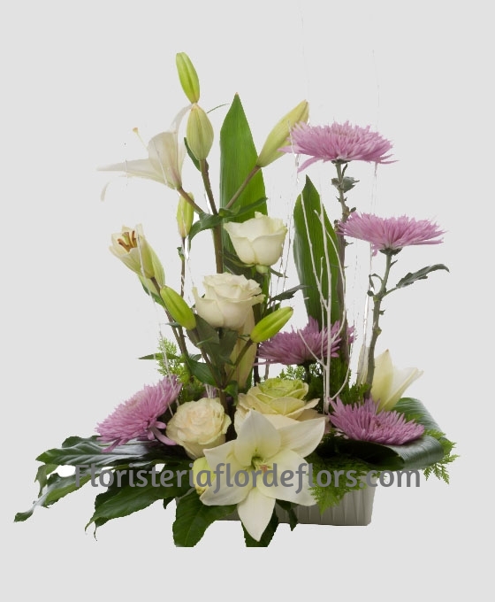 Pequeño Centro Funerario Sencillo. Está compuesto por una base con liliums, gerberas rojas, rosas, claveles y adornadas con verdes espectaculares (4 rosas, 2 liliums, 4 anastasias, salix, verdes variados y esponja). Si quiere comprar flores para tanatorio o enviar flores para difuntos, nuestros trabajos, están siempre realizados con flores para sepelios y verdes de primera calidad y nos lo suministran tanto proveedores nacionales, como internacionales. Trabajos de flores para fallecidos efectuados de forma artesanal por nuestros profesionales floristas por lo que su centro quedará bonito y elegante.